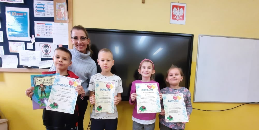 24 listopada została wręczona nagroda przez Panią Dyrektor za wyróżnienie pracy dla ucznia klasy II Kuby Siemaszko ,oraz dyplomy dla uczniów, którzy brali udział w konkursie : „MOJA ULUBIONA POSTAĆ Z BAJKI” zorganizowanym przez Pedagogiczną Bibliotekę Wojewódzką im. J.G. Pawlikowskiego w Przemyślu. Jeszcze raz gratulujemy i zachęcamy wszystkich uczniów do udziału w konkursach.