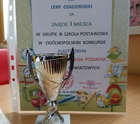 Lena Osadzińska, uczennica klasy I, zajęła I miejsce w powiatowych eliminacjach Ogólnopolskiego Konkursu Plastycznego „Młodzież Zapobiega Pożarom”. Gratulujemy i życzymy dalszych sukcesów!